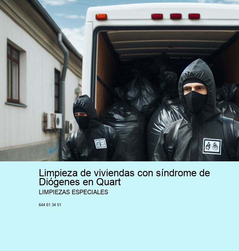 ¿Por qué esperar? Contacte con nosotros hoy mismo y recupere la tranquilidad y seguridad de su hogar. Llame ahora para obtener un presupuesto gratuito y sin compromiso. Mejor opción para la Limpieza de viviendas con síndrome de Diógenes en Quart !LLAMA AHORA¡ No enfrente este desafío solo, estamos aquí para ayudarle en cada paso del proceso. ¡Transforme su hogar y su vida con Limpiezas Especiales!